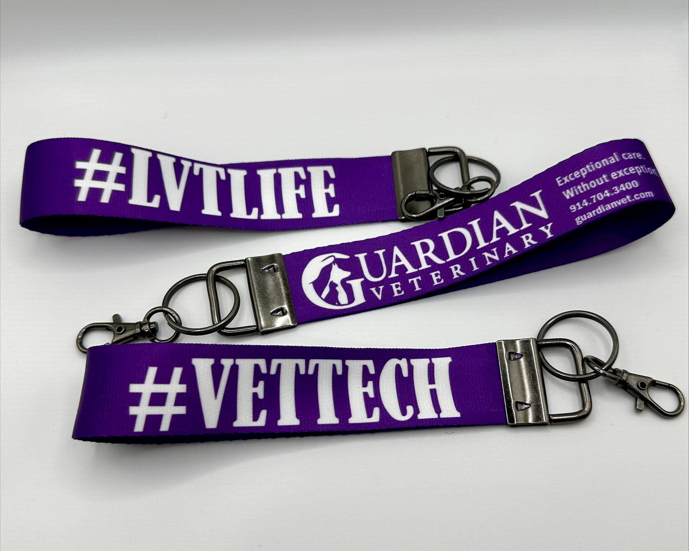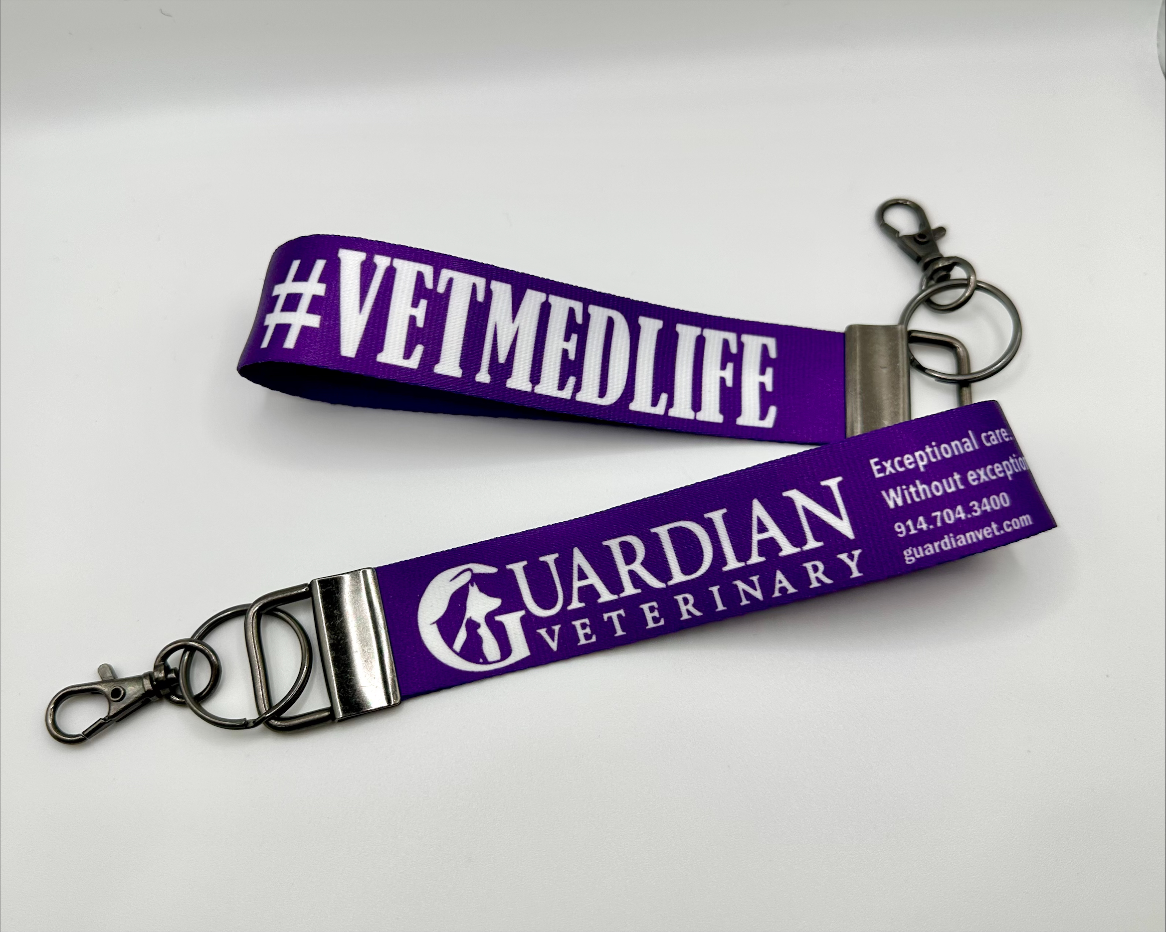 Your wristlet keychain will be custom printed with your chosen design or name on one side, and the Guardian Veterinary logo on the other.