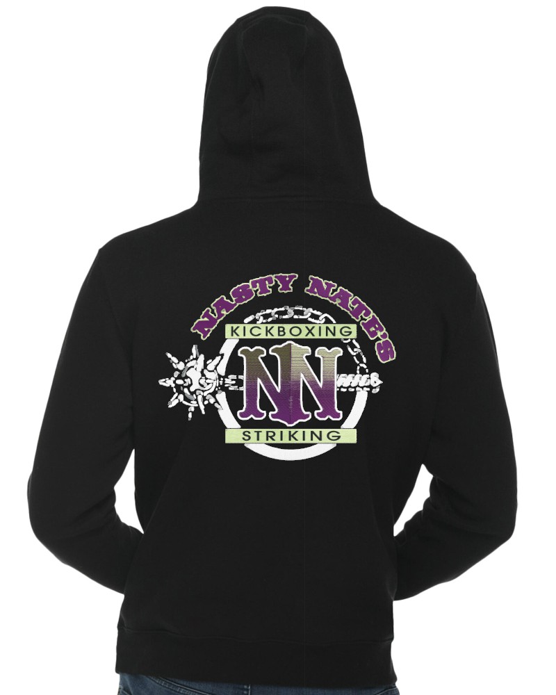 Our “Nasty Nate’s” hoodie will be custom embroidered with the large design on the back, and a small coordinating design on the front, left chest!