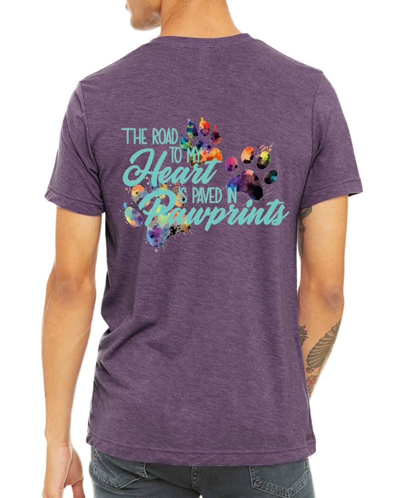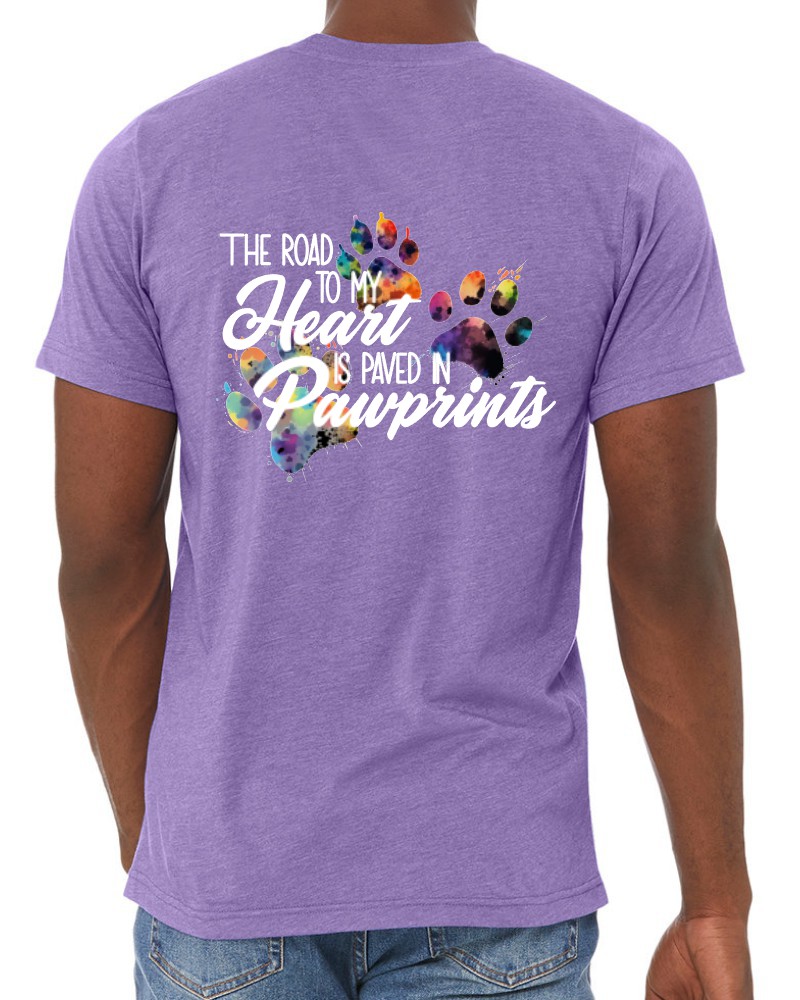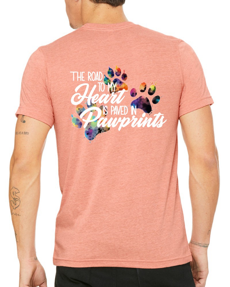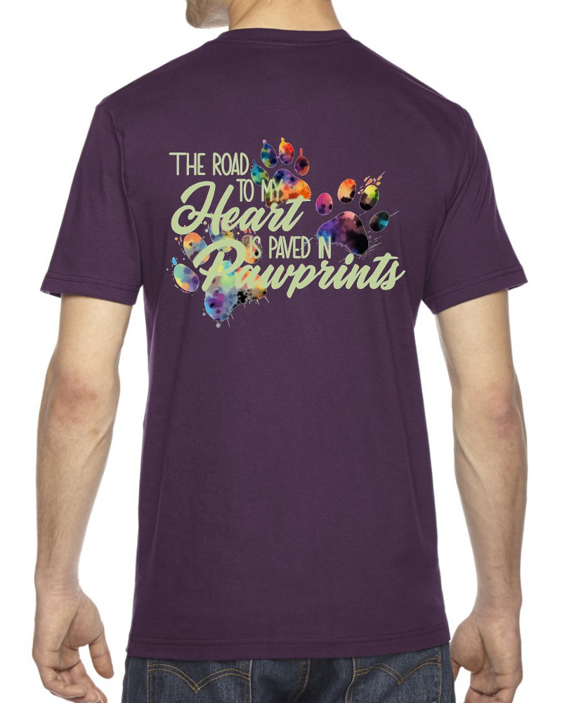 Our “Road to My Heart” crewneck tee will be custom printed with the large design on the back, and the Guardian Veterinary logo printed on the front, left chest.