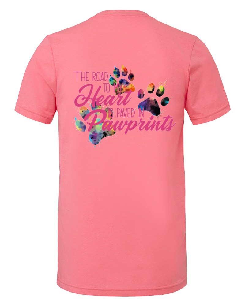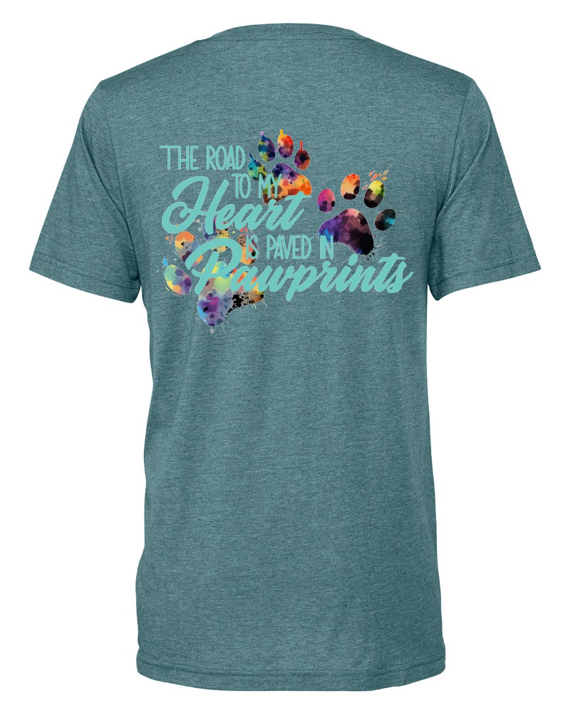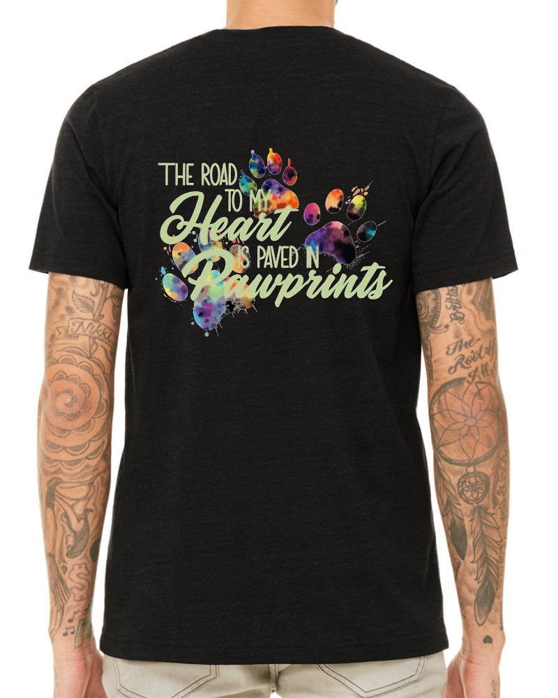 Our “Road to My Heart” V-neck tee will be custom printed with the large design on the back, and the Guardian Veterinary logo printed on the front, left chest.