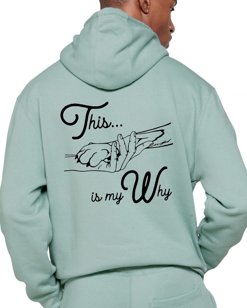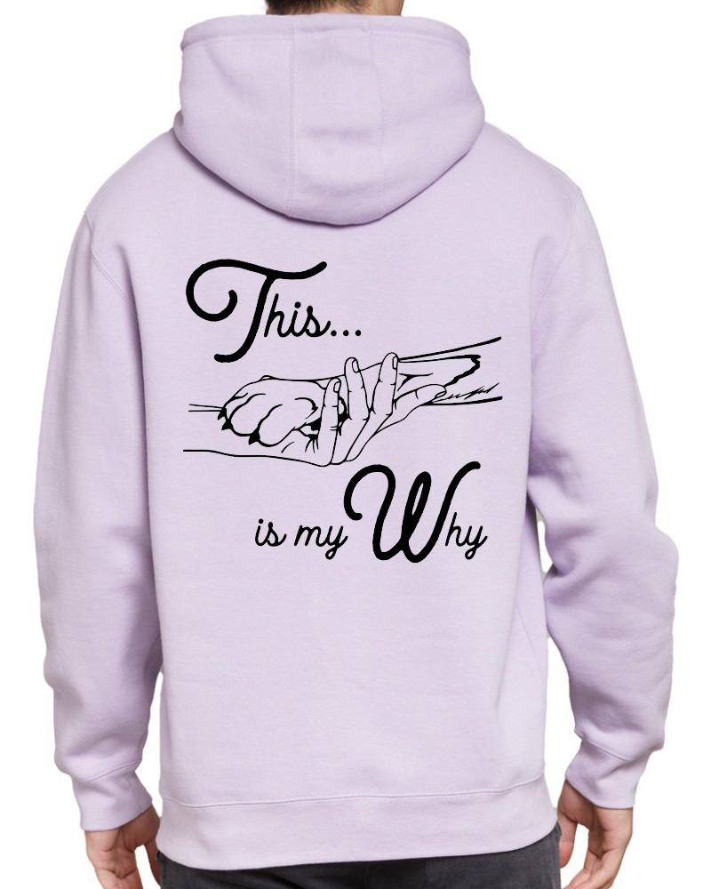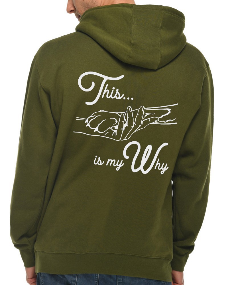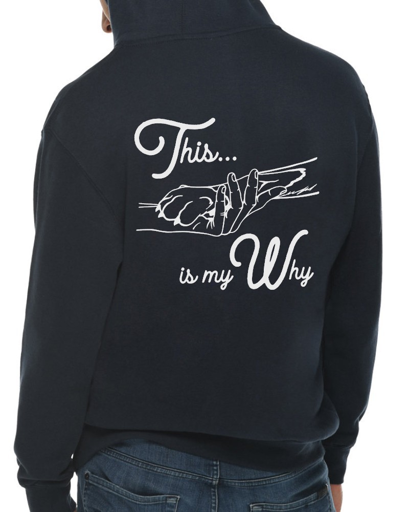 Our “This is My Why” hoodie will be custom printed with the large design on the back, and the Guardian Veterinary logo printed on the front, left chest.