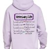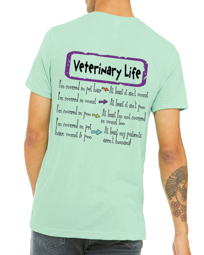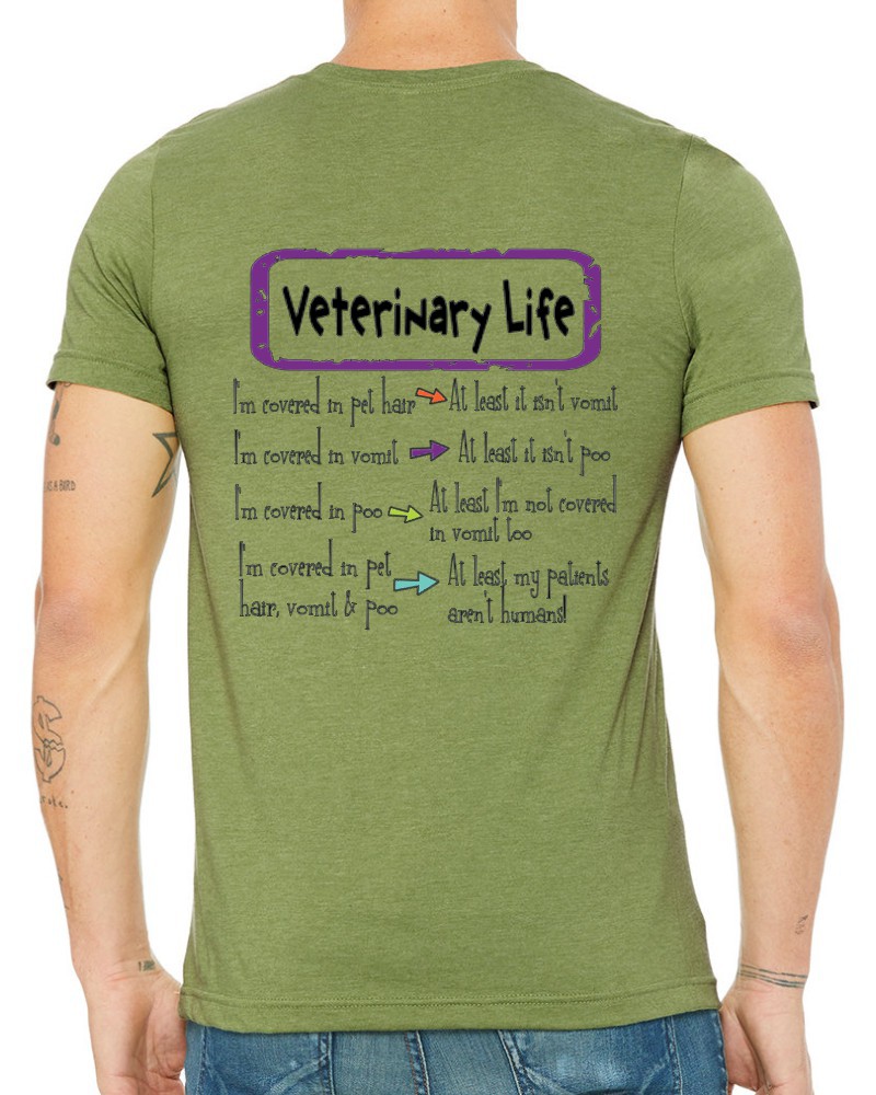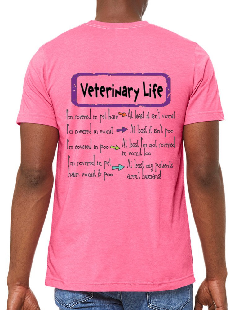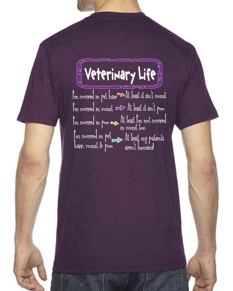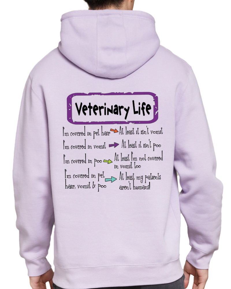Our “Veterinary Life!” hoodie or tee will be custom printed with the large design on the back, and the Guardian Veterinary logo printed on the front, left chest!