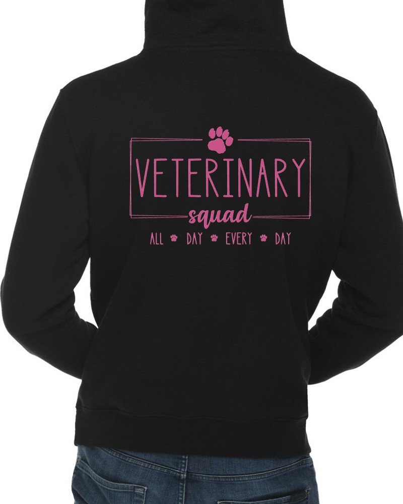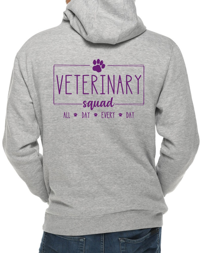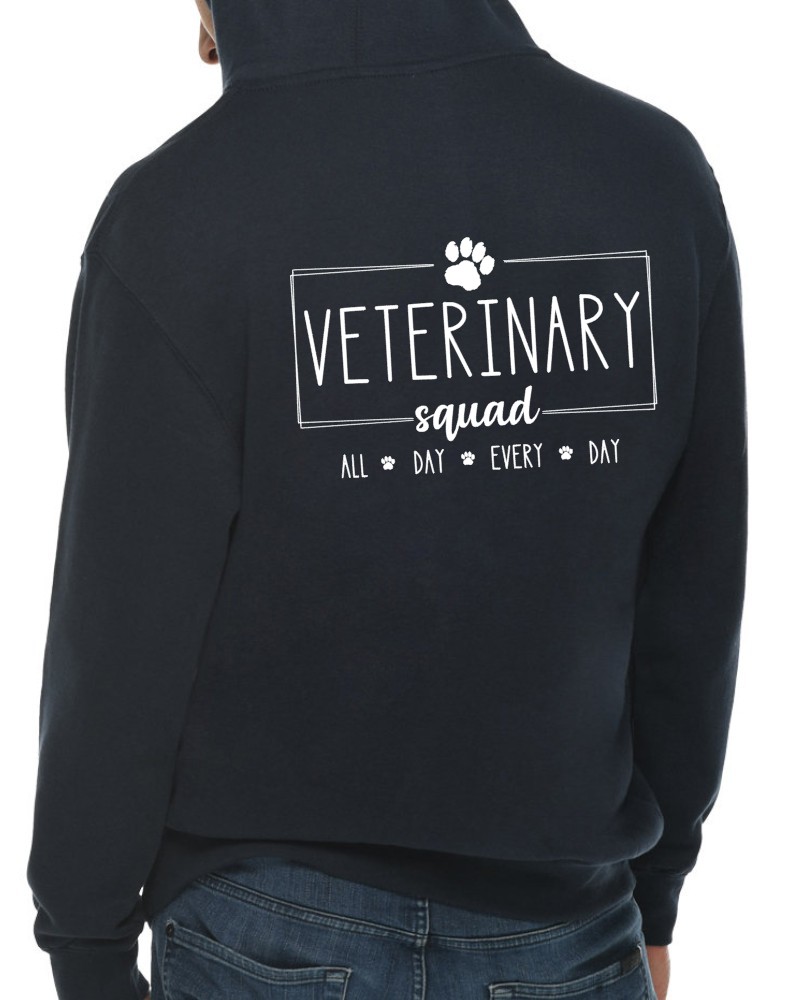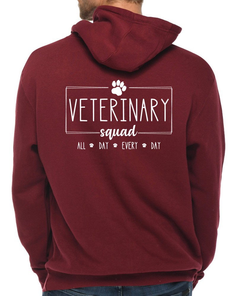 This “Veterinary Squad” hoodie will be custom printed with the large design on the back, and the Guardian Veterinary logo printed on the front, left chest.