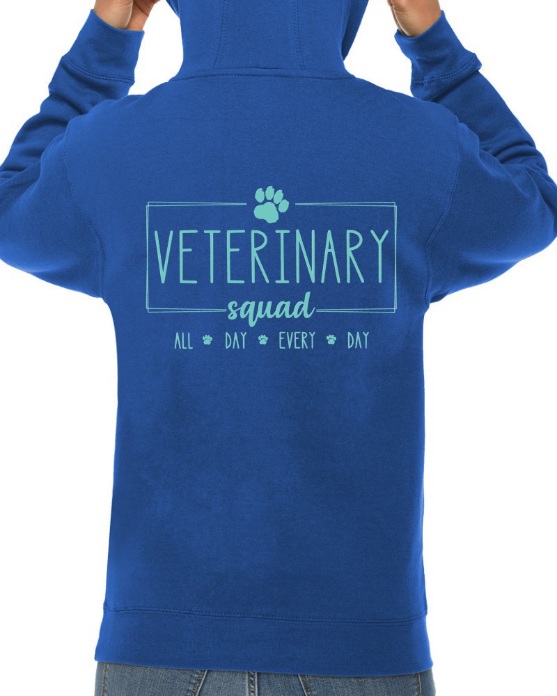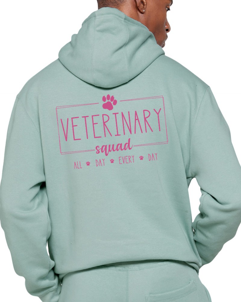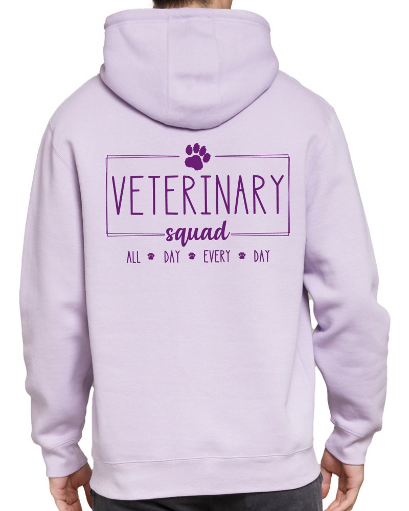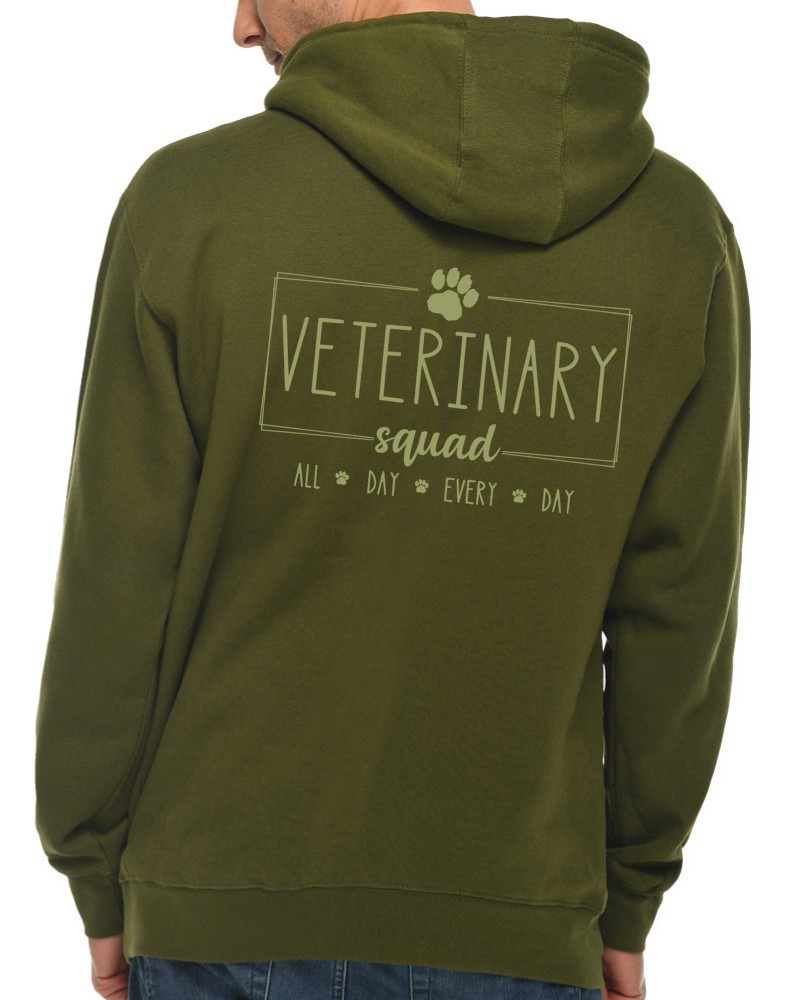 This “Veterinary Squad” hoodie will be custom printed with the large design on the back, and the Guardian Veterinary logo printed on the front, left chest.