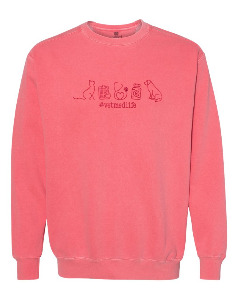 Our “#VETMEDLIFE” fleece crewneck or heavy tee will be custom embroidered with the large 10″ x 3″ design across the chest!